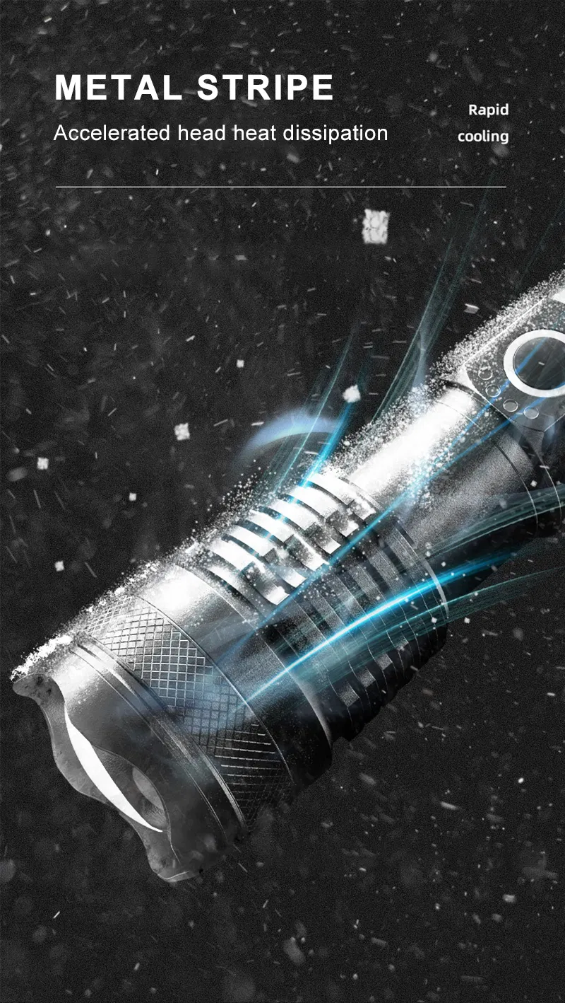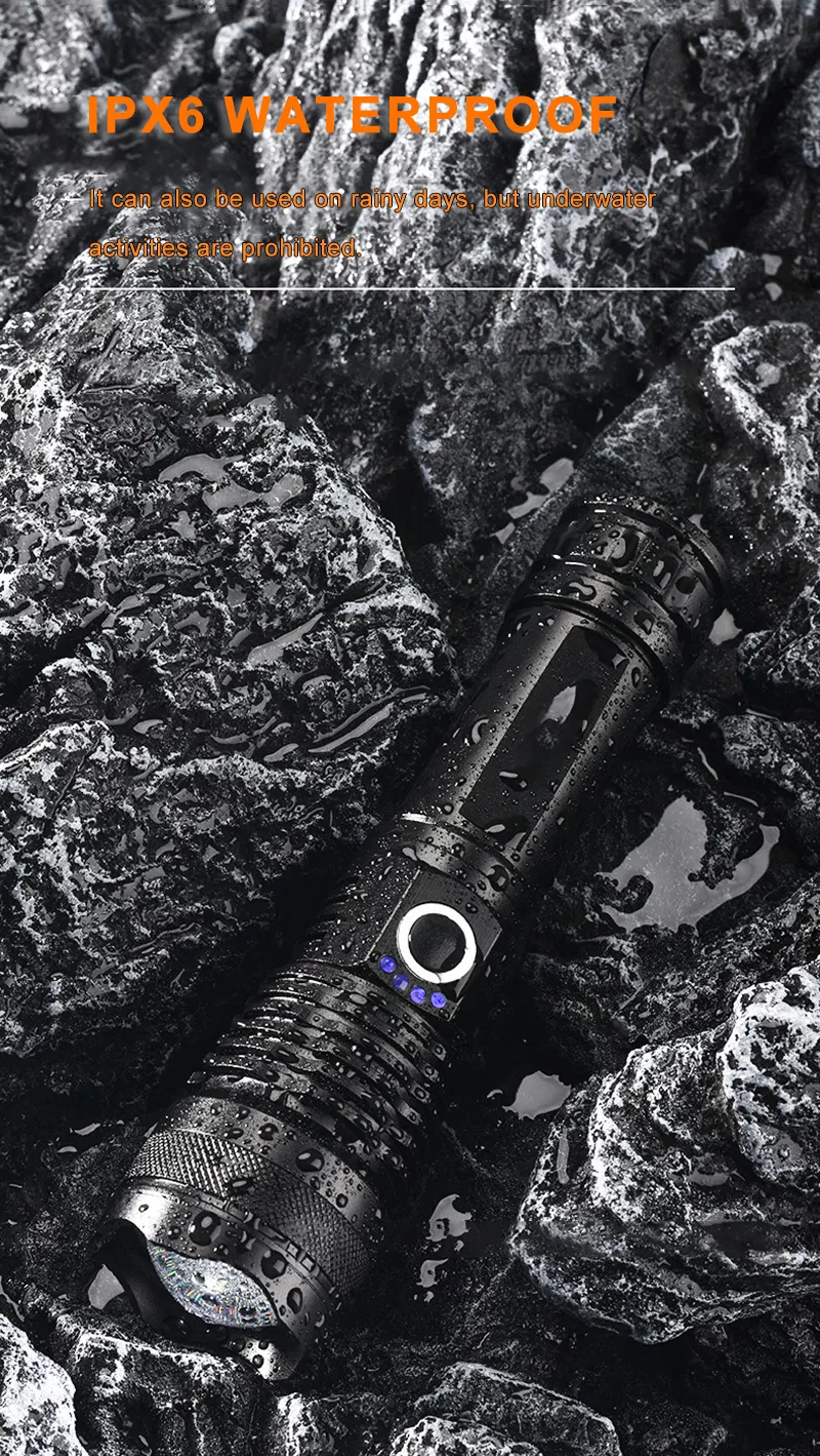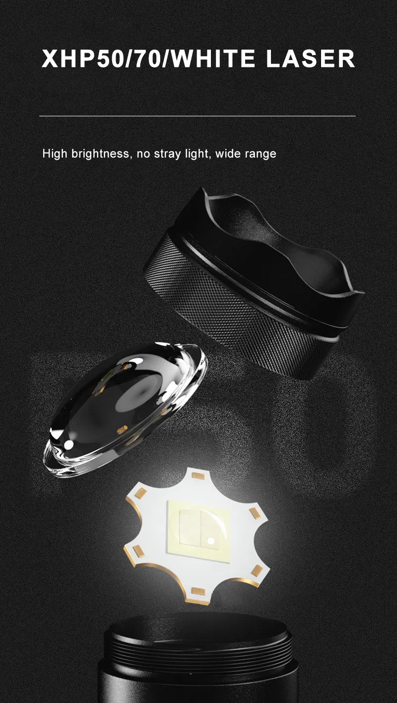 The flashlight features a White Laser LED that can reach a lighting distance of up to 1000 meters.