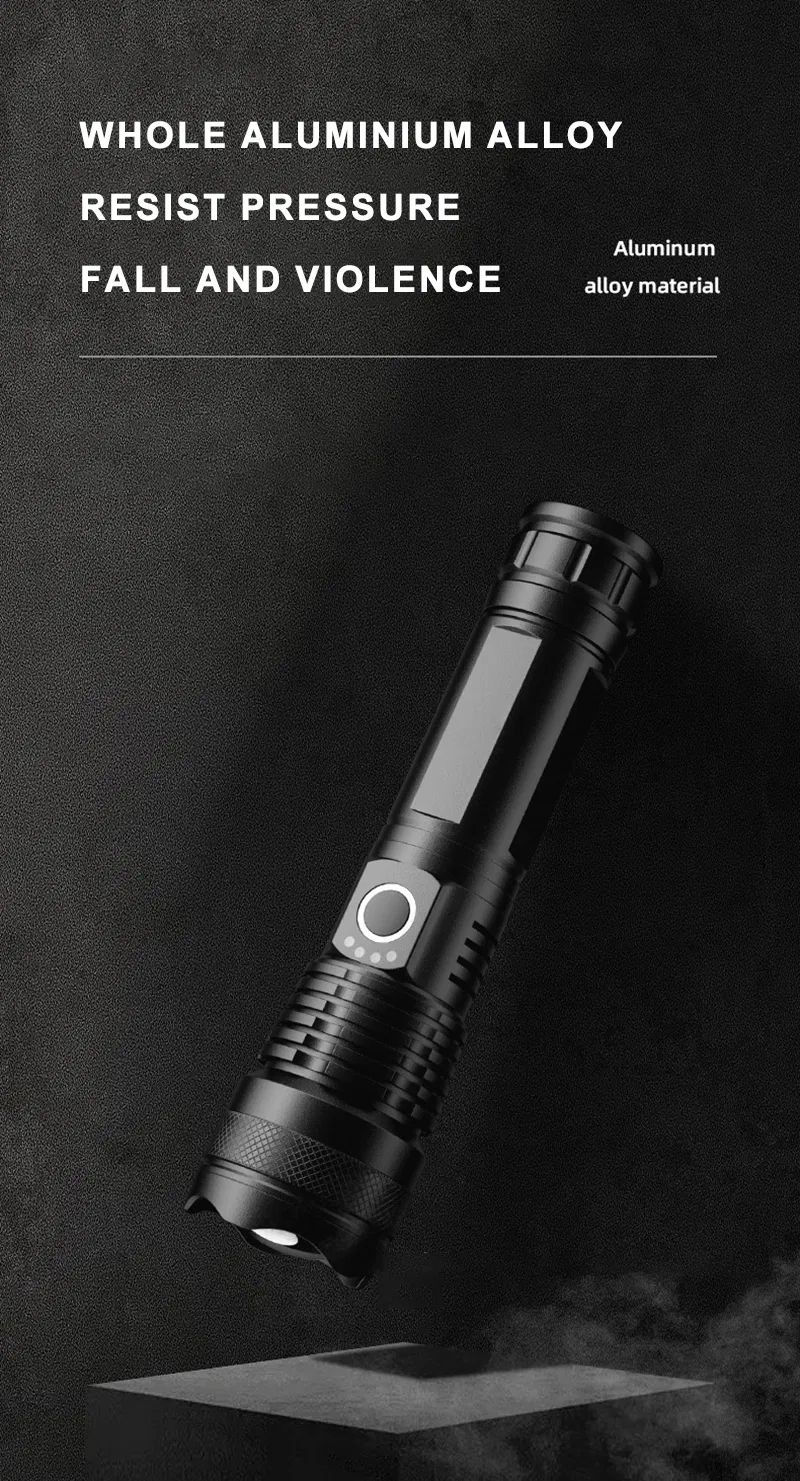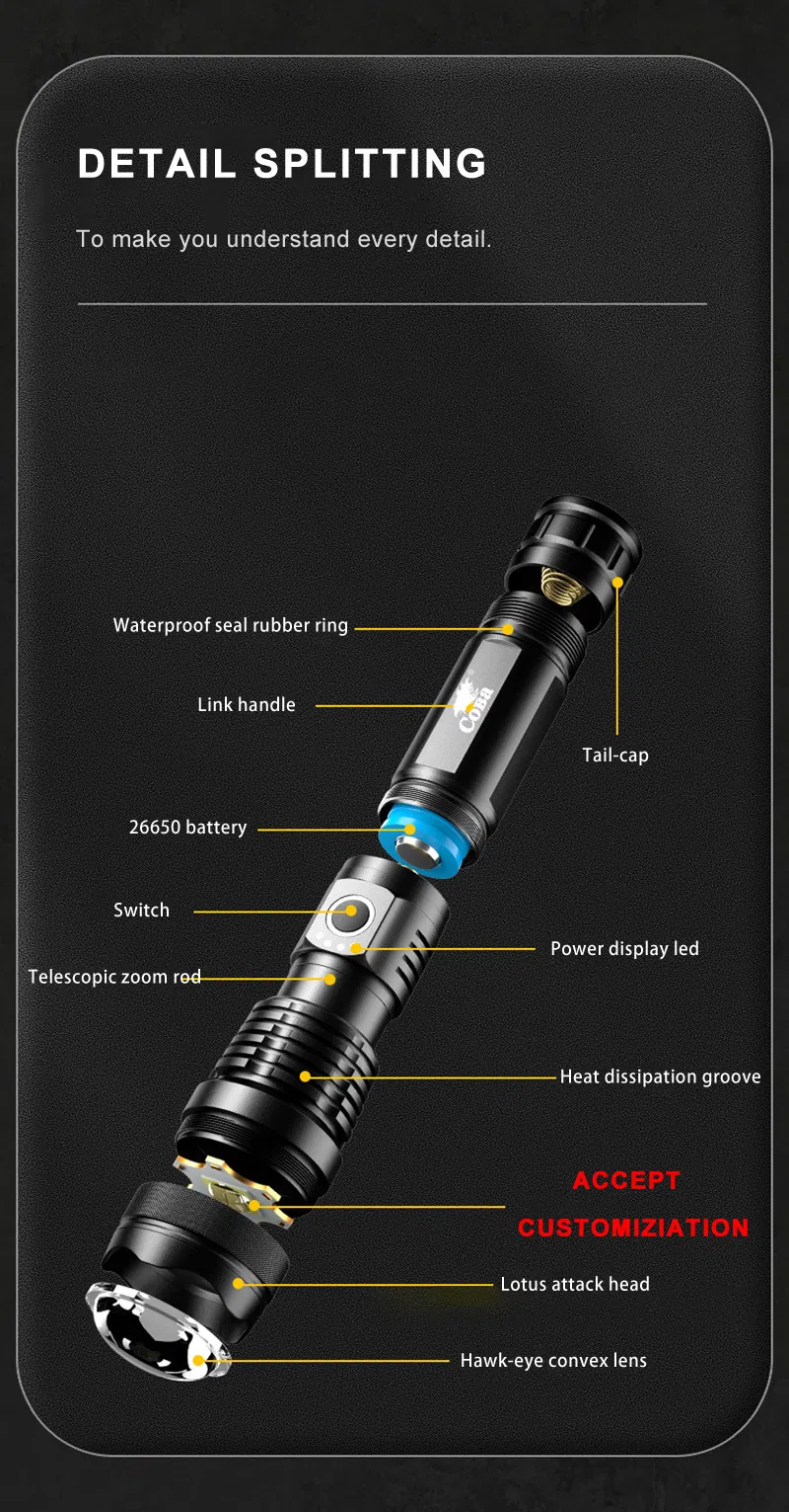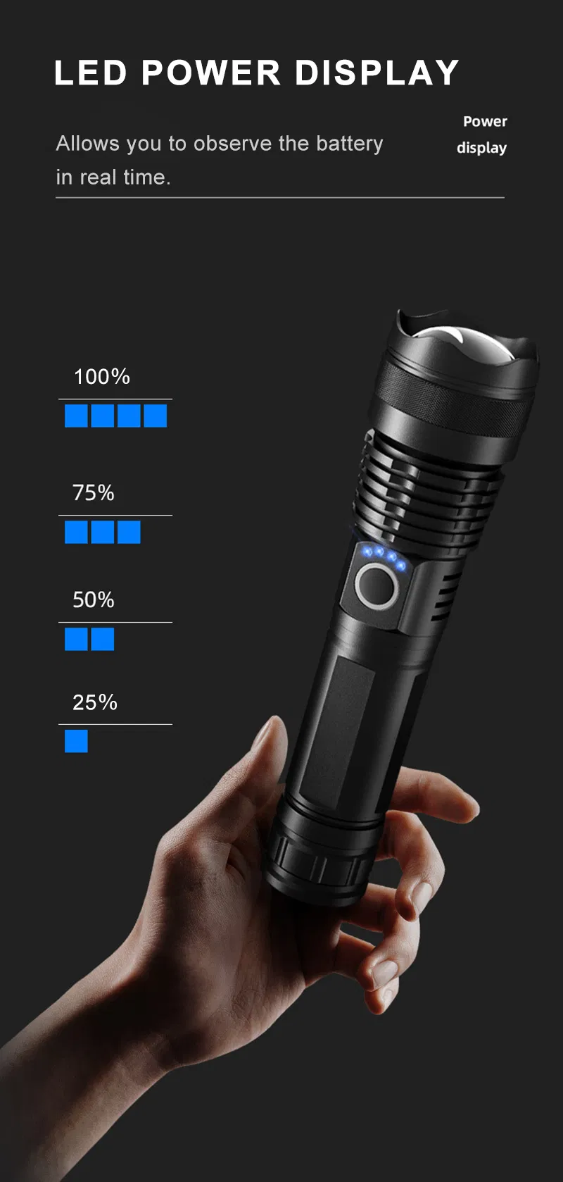 The flashlight features a White Laser LED that can reach a lighting distance of up to 1000 meters.