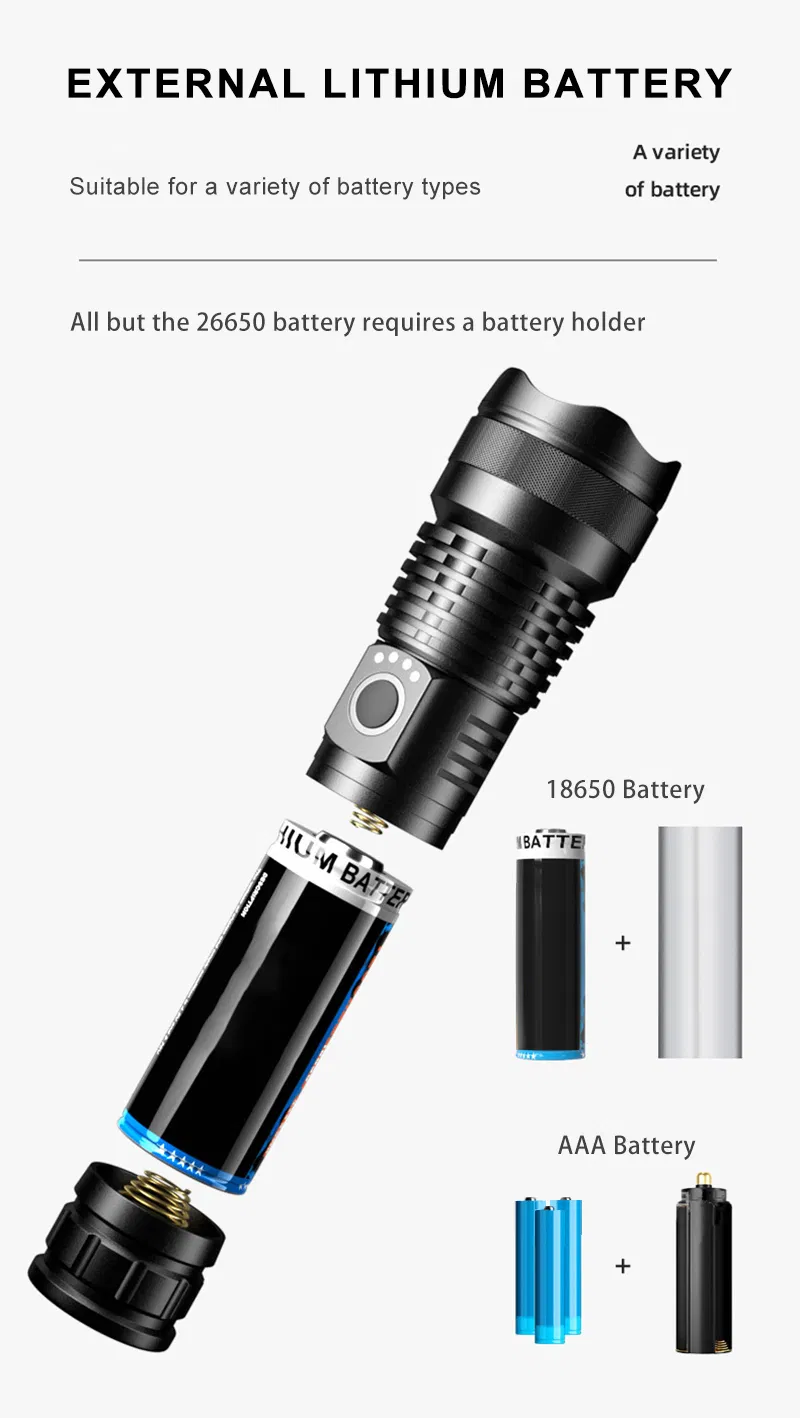 It is highly versatile and supports 26650 lithium batteries, 18650 batteries, or 3 AAA batteries using the included holders.