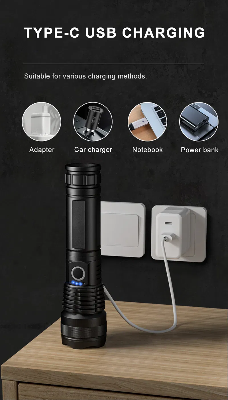 It uses a modern Type-C USB charging interface, allowing for fast and convenient recharging via power banks, wall adapters, or PCs.
