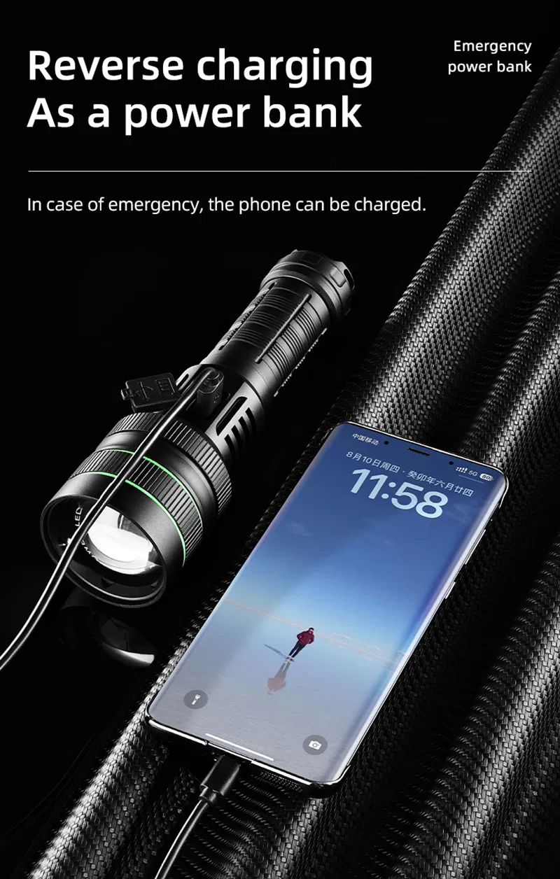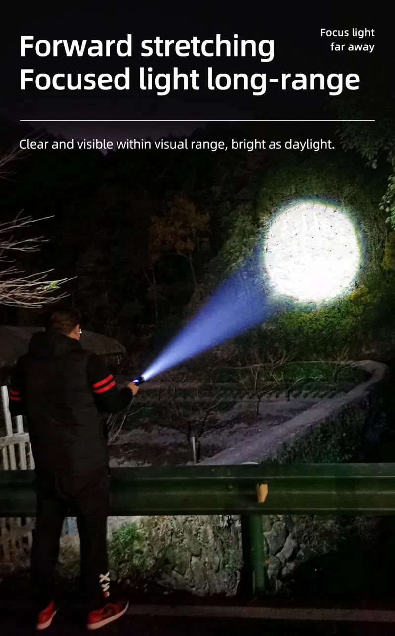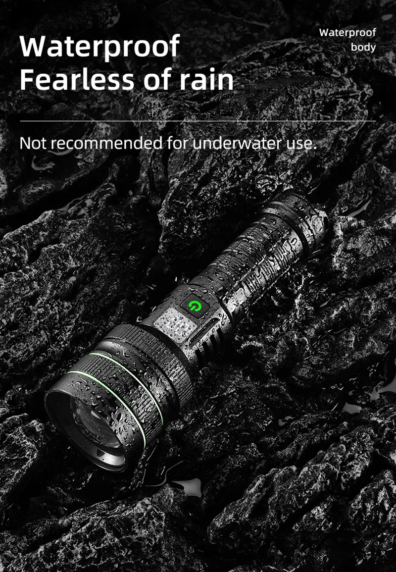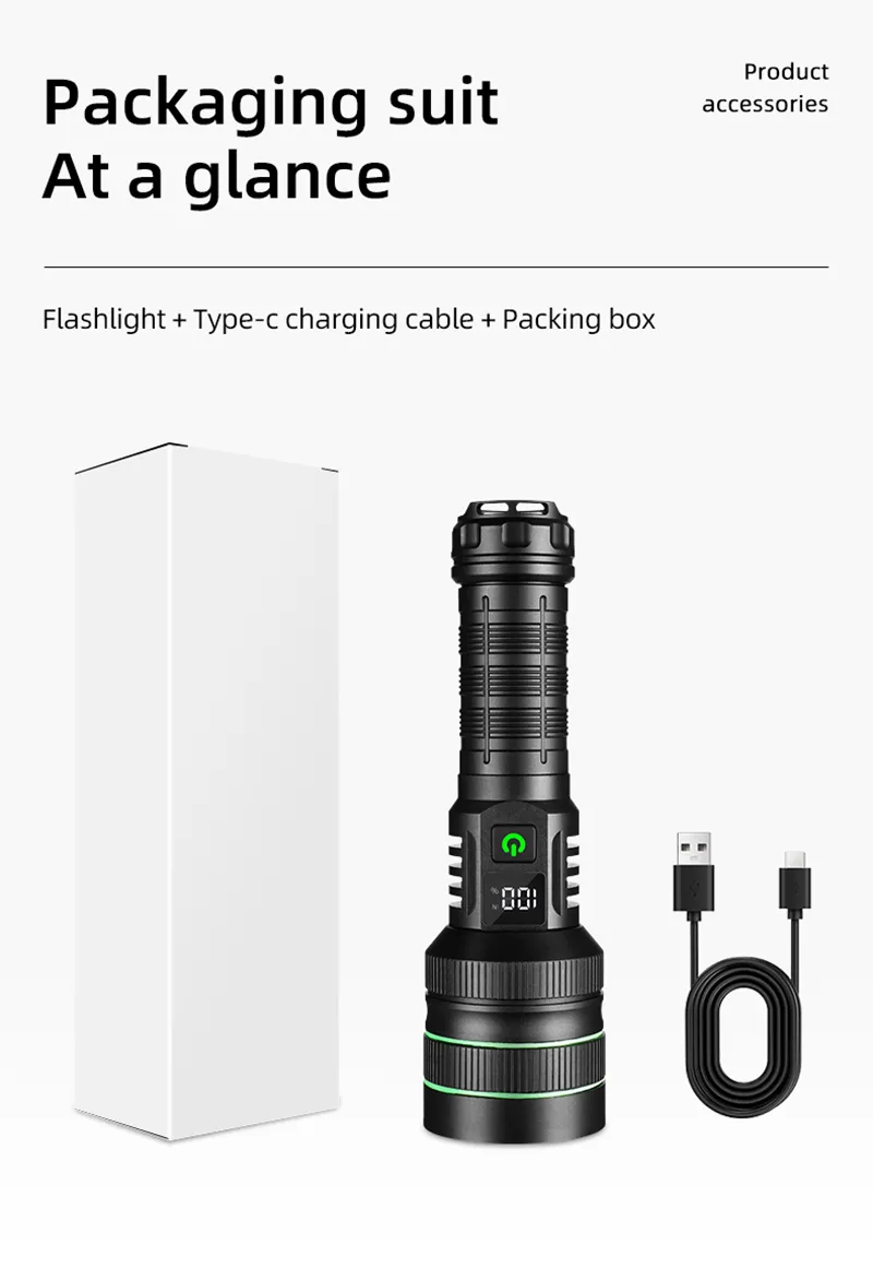 This powerful LED flashlight features a 30W white laser bead, providing exceptional brightness and a long-distance beam. Built with a durable aluminum alloy body, it is designed for hiking, camping, and self-defense. The Type-C rechargeable system ensures quick charging, while the USB output allows the device to serve as an emergency power source for your phone.