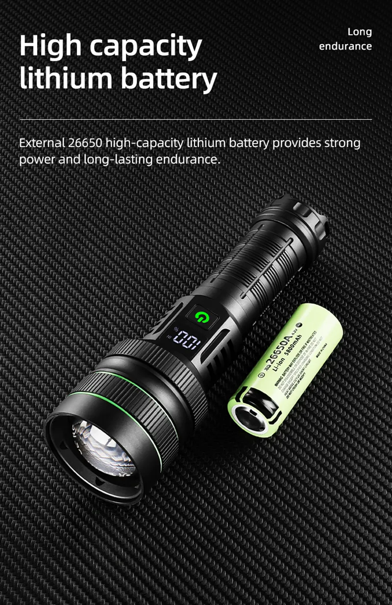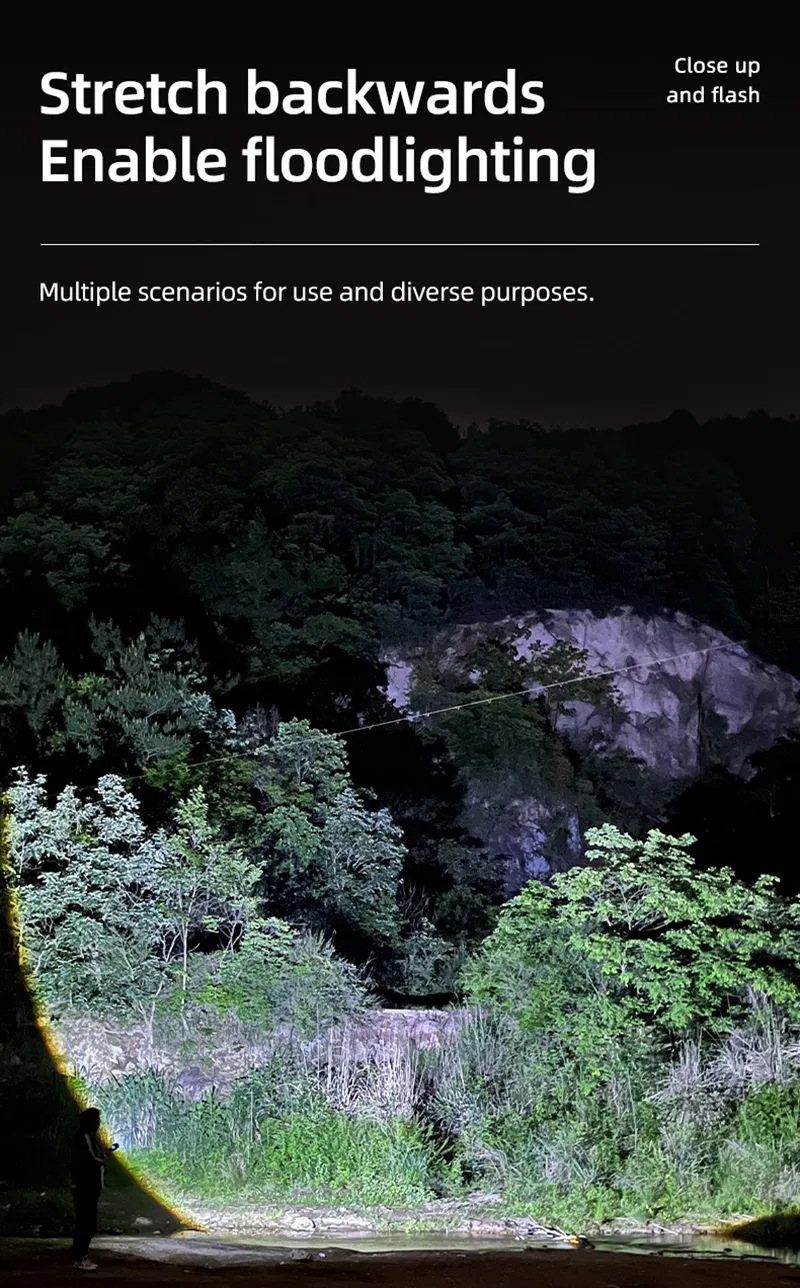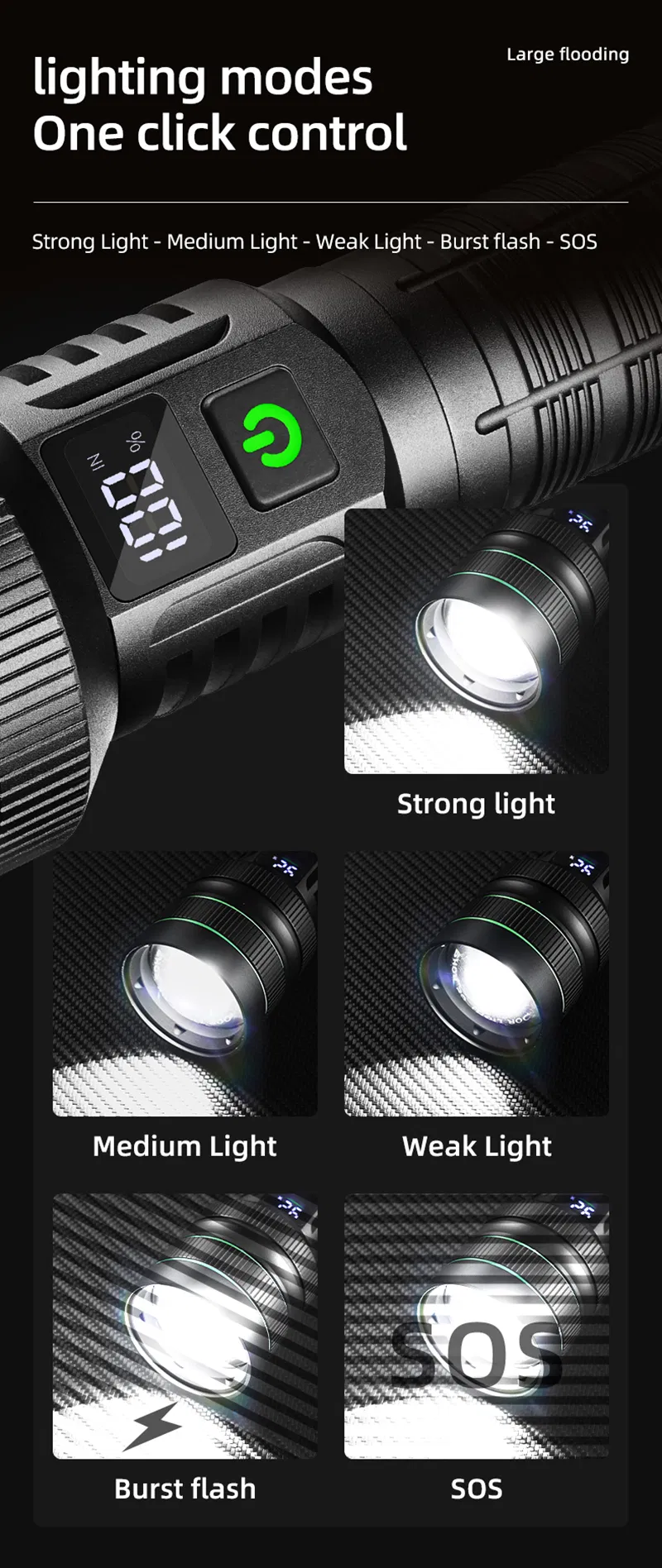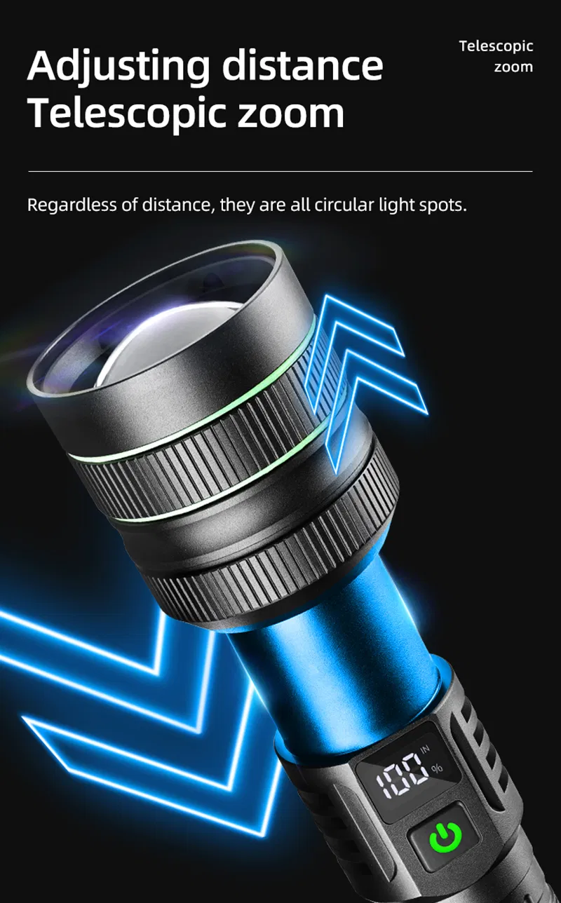 This powerful LED flashlight features a 30W white laser bead, providing exceptional brightness and a long-distance beam. Built with a durable aluminum alloy body, it is designed for hiking, camping, and self-defense. The Type-C rechargeable system ensures quick charging, while the USB output allows the device to serve as an emergency power source for your phone.